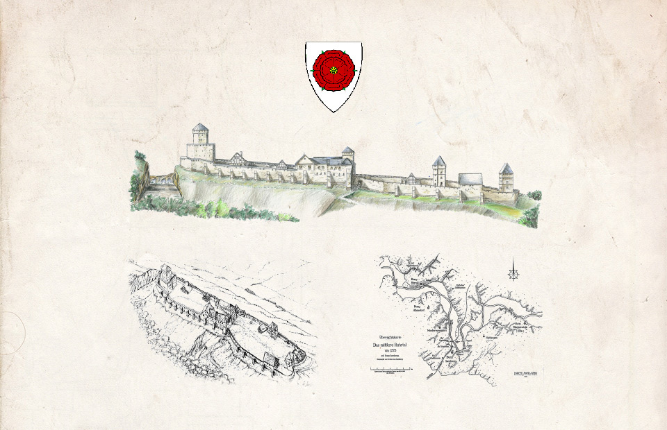 ie Oberburg war durch ein eigenes starkes Wehrsystem geschützt. Der gewaltige Bergfried steht als “Frontturm” an der höchsten Stelle der südwestlichen Angriffsseite, unmittelbar mit der in diesem Bereich verstärkten umlaufenden Ringmauer verbunden.